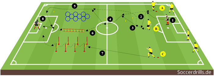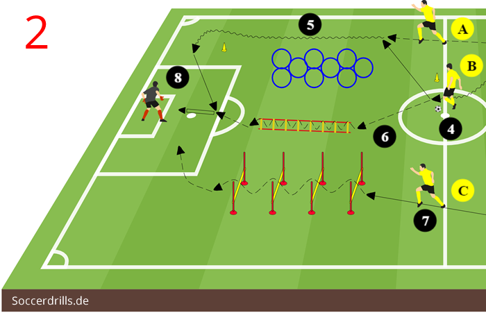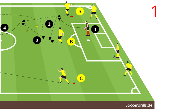 - B dribbelt die Linie entlang umrundet das Hütchen und passt flach oder flankt vors Tor auf A oder C.