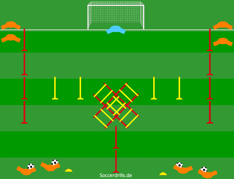 Material: Ein Tor, 14 Slalomstangen, 2 Koordinationsleitern, 10 Bodenmarkierungen und ausreichend Bälle.