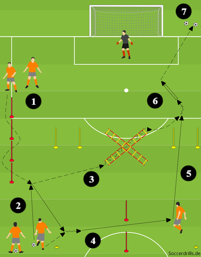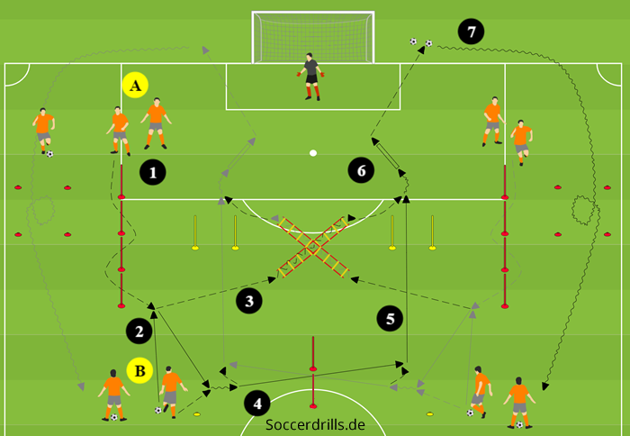 Wichtig im Ablauf ist das gute Zusammenspiel der beiden Spieler, die beim Start die Bälle haben. Sie müssen nicht nur gute Doppelpässe mit den Mitspielern ausführen, die aus dem Slalomlauf kommen, sondern zusätzlich einen präzisen Ball-Seitenwechsel ausführen. Hinzu kommen die exakten und gut getimten Pässe durch die Schnittstellen (gelbe Stangentore in der Grafik), wobei die Stangentore gleichzeitig als Abseitslinie zu beachten sind. Der Seitenwechsel bei den Pässen ist nicht zu unterschätzen. Es wird mit zwei Bällen gepasst und deshalb müssen die vorherigen Doppelpässe schnell und druckvoll ausgeführt werden, sonst wird die Ballannahme wegen Zeitmangel zum Problem.