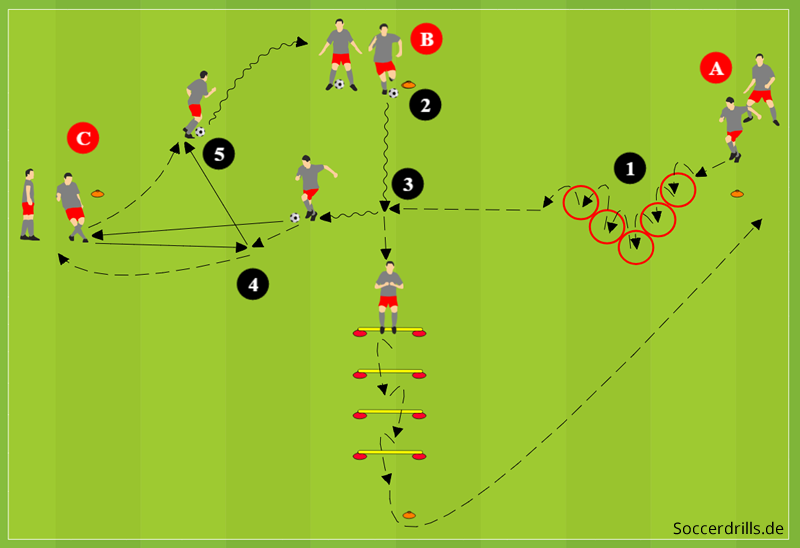 - Im Zentrum überlässt B den Ball an A. B läuft anschließend auf die andere Seite und überläuft/überspringt die Stangen nach Vorgabe, um dann um die Markierung herumlaufend Position A einzunehmen.