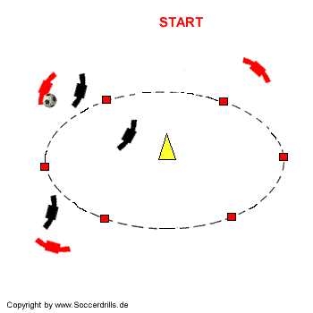 Team "Rot" versucht das Hütchen im Kreis zu treffen. Die roten Spieler passen sich den Ball am Kreis zu und dürfen sich zum Freilaufen durch den Kreis bewegen. Von den schwarzen Spielern darf nur der "Hütchentorwart" in den Kreis. Die Berührung des Balles im Kreis ist beiden Teams nicht erlaubt.