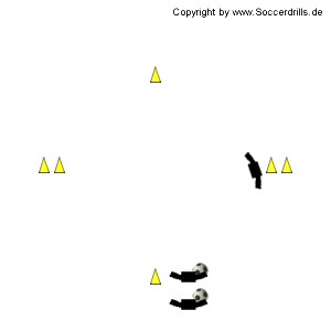 Material: Ausreichend Bälle, 6 Hütchen oder Markierungen zur Orientierung.