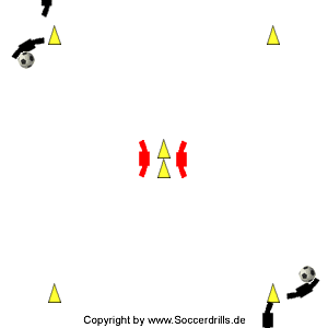 Markiere ein Quadrat mit zwei Hütchen (Makierungstellern) im Zentrum. An zwei Ecken des Quadrates befindet sich eine Gruppe und im Zentrum zwei Anspieler. Die beiden Gruppen starten diagonal versetzt in den Ecken. In der Animation befinden sich die Gruppen in der linken unteren und rechten oberen Ecke. Der Pass erfolgt vom ersten Spieler der beiden Ballgruppen zum Anspieler im Zentrum. Anschließend läuft der Passgeber in die nächste linke Gruppe. Dort erhält er den Rückpass aus dem Zentrum und schließt sich dann wieder seiner Startgruppe an. Je weniger Spieler pro Gruppe zur Verfügung stehen, desto intensiver wird diese Übung.