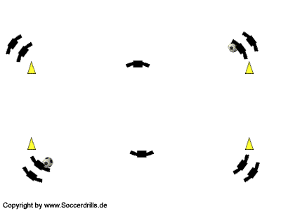 Markiere ein Rechteck mit Hütchen (Makierungstellern). Die Ecken im Rechteck müssen jeweils mit zwei Spielern besetzt sein. Ist die Anzahl der Spieler höher, ist die Übung einfacher, weil mehr Zeit zum Überlegen bleibt. In zwei Gruppen befindet sich jeweils ein Ball. Die Gruppen mit Ball müssen diagonal zueinander stehen. Auf den beiden langen Strecken des Rechtecks befindet sich jeweils ein Spieler. Die Ballbesitzer passen auf die gegenüberliegende Langbahn und laufen anschließend auf die Langbahn-Position, die sich direkt neben den Passgebern befindet. Die Spieler auf der langen Seite des Rechtecks kontrollieren den Ball und passen diagonal weiter in die nächste Ecke. Sie folgen ebenfalls nicht ihrem Pass, sondern laufen diagonal auf die Position, von der sie den Pass erhalten haben. Jetzt beginnt der gleiche Ablauf von der anderen Seite.