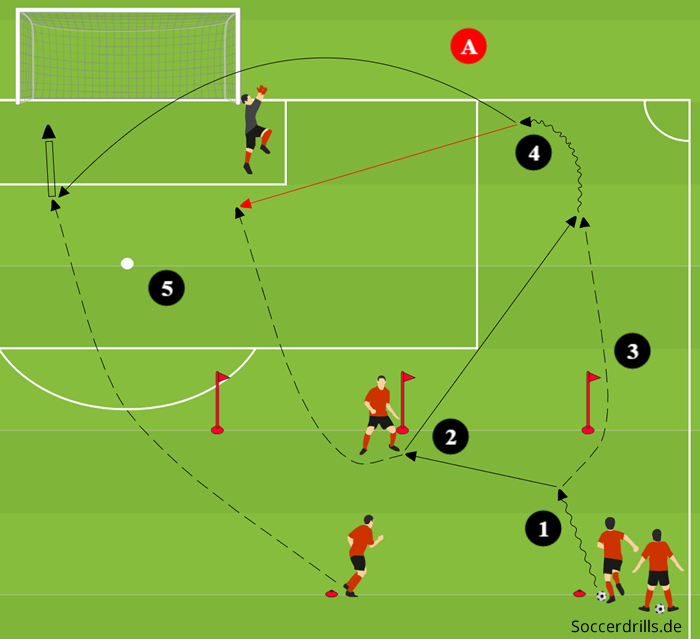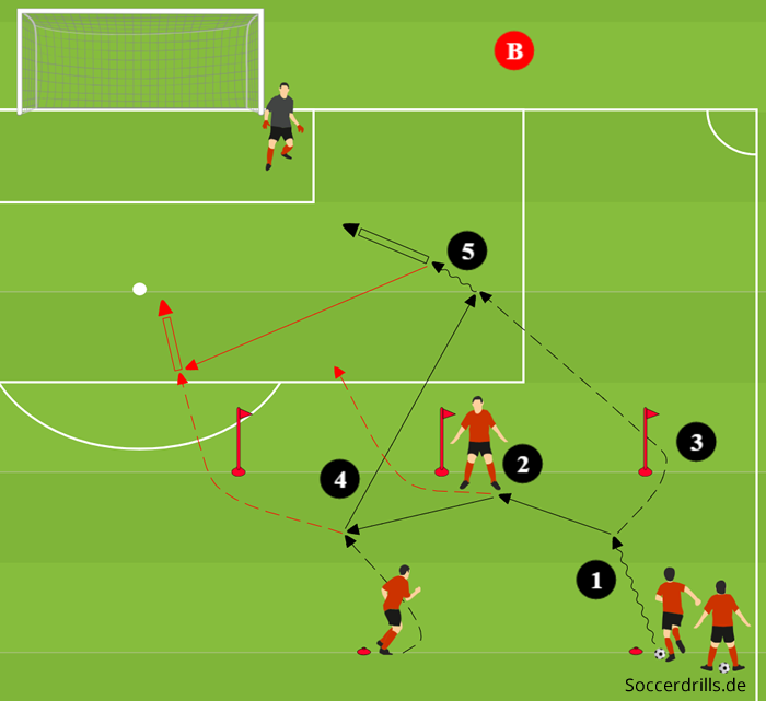 - Die beiden anderen Spieler sind zum Tor gestartet und öffnen den Raum, einer läuft Richtung vorderen und einer zum hinteren Pfosten.