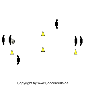 Zwei Gruppen stehen sich frontal gegenüber. In einer Gruppe befindet sich ein Ball. Der erste Spieler der einen Gruppe (ohne Ball) startet zum Hütchentor und erhält dort ein genaues Zuspiel. Nach Ballannahme passt er den Ball zum nächsten Übenden der Passgruppe zurück. Der Passgeber und der Passempfänger tauschen anschließend die Seiten.