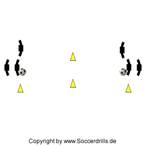 Zwei Gruppen stehen sich frontal gegenüber. Der erste Spieler jeder Gruppe hat einen Ball. Die Ballbesitzer dribbeln frontal auf das Hütchentores zu. Direkt vor dem Hütchentor passen sich die Spieler den Ball zu und führen gleichzeitig eine Wende (Turn) aus. Anschließend erfolgt ein Pass in die eigene Gruppe zurück. Die Übenden schließen sich, ihrem Pass folgend, wieder ihrer Startgruppe an.
