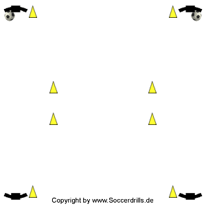 Baue das Übungsfeld auf, wie in der Animation zu sehen. Jede Übungsseite erhält einen Ball. Bitte beachte die richtige Position der Bälle, sonst funktioniert später der Ablauf der weiterführende Einheiten nicht. In der Animation befinden sich die Bälle in den oberen Gruppen. Es ist auch möglich, mit den Bällen in den unteren Gruppen zu starten. Der erste Pass erfolgt (gleichzeitig in jeder Gruppe) zum entgegenlaufenden Spieler. Dieser nimmt den Ball an und dribbelt durch das "Nadelöhr". Anschließend stoppt der Spieler den Ball (Ball ruht!) und läuft auf die andere Seite. Der (dort ruhende) Ball wird migenommen, um einen Rückpass in die Ausgangsgruppe der anderen Seite zu spielen. Die Übenden folgen ihrem Pass und schließen sich der jeweiligen Gruppe an.