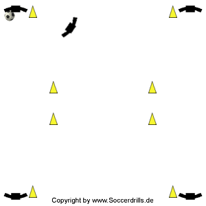 Nur eine Gruppe erhält einen Ball. Der erste Pass erfolgt zum entgegenlaufenden Spieler. Dieser nimmt den Ball an und dribbelt durch das "Nadelöhr". Jetzt spielt er einen diagonalen Rückpass in die andere Gruppe und folgt seinem Pass. Der Startspieler folgt ebenfalls seinem Pass und schließt sich der gegenüberliegenden Gruppe an.