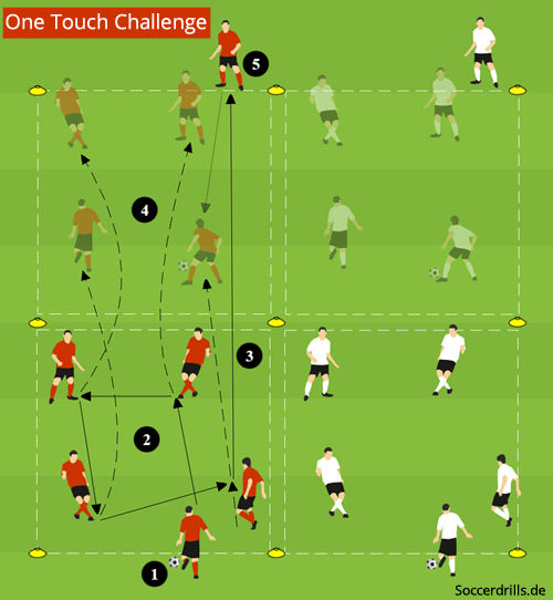 Schaue dir die Hinweise zum Ablauf der One Touch Challenge an. Es gibt viele Lösungsansätze, um das Tempo zu erhöhen, allerdings sind diese oft mit einem hohen Fehlerrisiko verbunden. So könnten die Spieler bereits direkt nach ihrem Pass in Richtung anderes Halbfeld starten, obwohl der Ablauf noch nicht beendet ist. Sicherlich ist das schneller, aber was ist, wenn ein Fehler passiert und der Ball ist weg? Wertvolle Zeit verstreicht und in der Challenge ist das Team dann chancenlos.