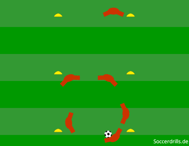 Haben die Spieler den Ablauf verinnerlicht, werden sie in den Pausen versuchen Lösungen zu finden, um noch schneller zu werden. Lass sie kommunizieren, dies ist ein wichtiger Bestandteil des Trainings. Kommen sie nicht von allein drauf, fordere sie dazu auf.