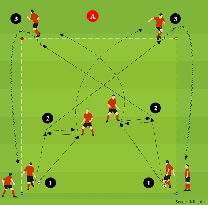 - Der Spieler oben in der Ecke passt zum Spieler im Zentrum und bietet sich seitlich vom Übungsfeld an, dort erhält er den Rückpass.