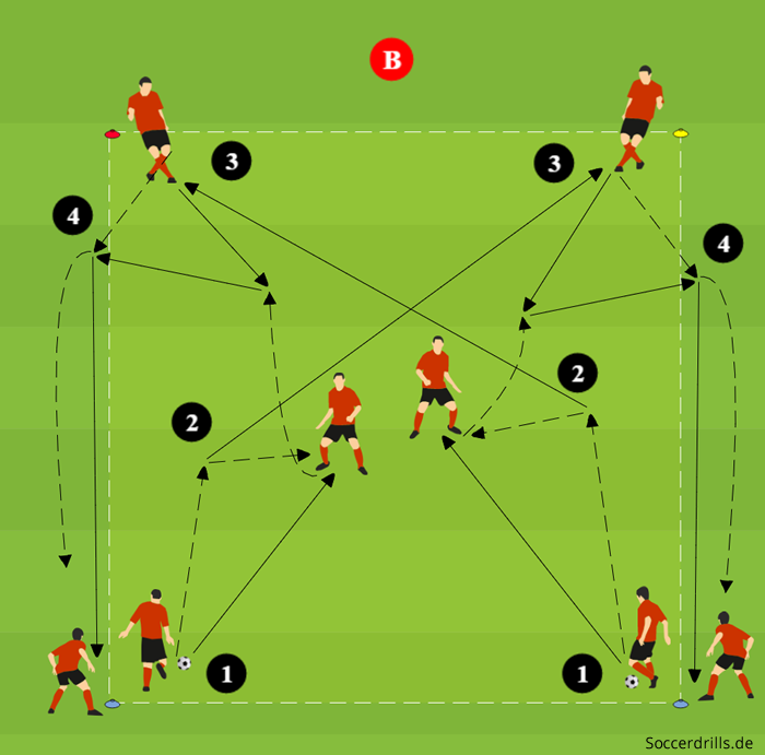 - Der Startspieler passt diagonal zum Spieler oben in der Ecke des Quadrates. Der Spieler im Zentrum übernimmt nach der Aktion die Position oben in der Ecke, der Startspieler läuft zur Zentrumsposition.