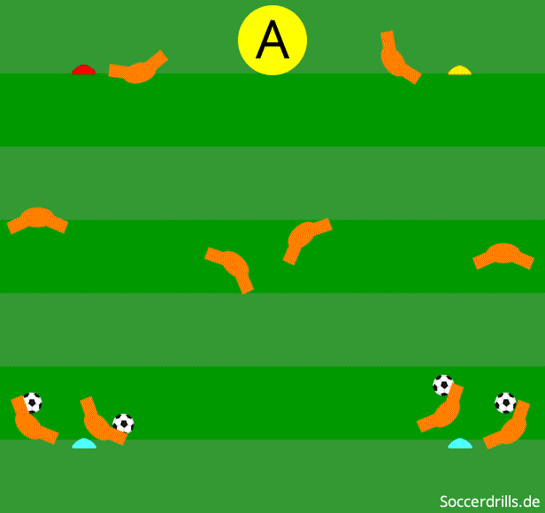 - Es wird nur Ablauf A ausgeführt. Auf Trainerkommando „Rot“ oder „Gelb“, wird an der entsprechenden Bodenmarkierung oben Ablauf B ausgeführt.