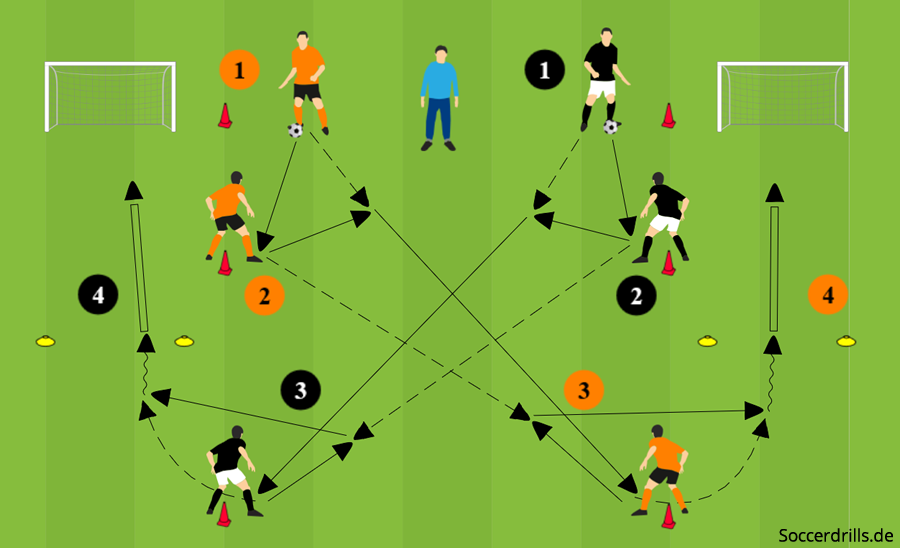 - Wettkampf: Jeweils der erste Spieler jeder Gruppe startet auf Trainerkommando. Wer zuerst mit einem Torerfolg abschließt, erhält einen Punkt für sein Team.