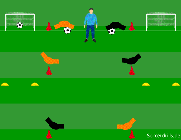 - Seitlich innen neben beiden Toren werden zwei Hütchen aufgestellt. Vertikal in einer Linie, werden auf jeder Übungsseite zwei weitere Hütchen platziert. Der Abstand zwischen den torentfernten Hütchen ist deutlich größer als der Abstand zwischen den ersten beiden Hütchen.