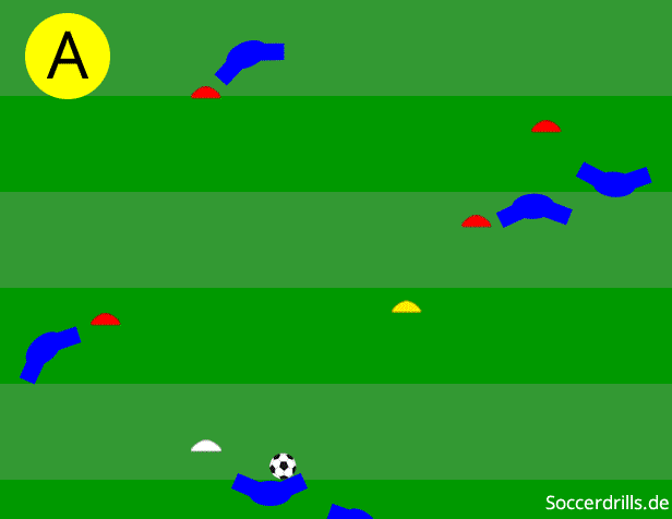 - Benötigte Materialien: 6 Markierungen (Hütchen, Pylonen o.ä.), mehrere Bälle, ggf. weitere Materialien als Anschlussaktion für Spieler E (s. Variationen).