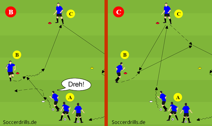 - Spieler A gibt mit seinem Eröffnungspass zu Spieler B das Kommando „Dreh“, B reagiert entsprechend. B dreht nach dem Zuspiel von A auf und spielt nun selbst zu C.
