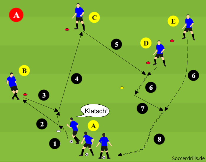 - Der erste Spieler von A dribbelt an und spielt einen kurzen Pass auf B. Mit dem Pass erfolgt von A das Kommando „Klatsch“.
