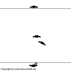 Zwei Spieler befinden sich jeweils an der Grundlinie, zwei weitere Spieler im Feld. Die Aufgabe besteht darin, den Ball durch geschicktes Passen von einer Grundlinie zur anderen zu befördern, wobei zunächst immer ein Spieler im Feld angespielt werden muss. Der Spieler, der nicht angespielt wird, versucht das Weiterleiten des Balles zu verhindern. Nach kurzer Zeit tauschen die Spieler ihre Positionen. Die Spieler an den Grundlinien gehen ins Feld und ungekehrt. ACHTUNG: Ist eine Weiterleitung des Balles nicht möglich, wird er auf den Passgeber zurückgespielt. Positionstausch nicht vergessen.