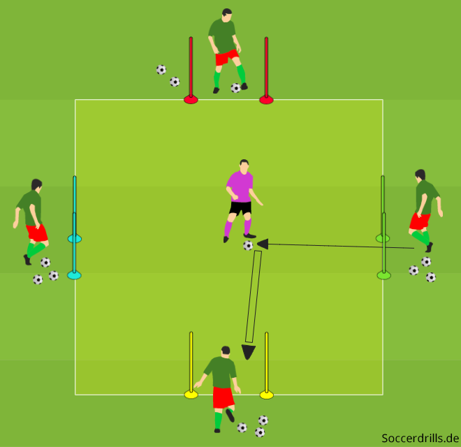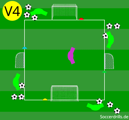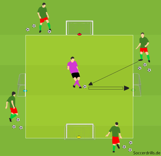 Material: 4 Minitore (Stangen/Hütchen), 4 verschiedenfarbige Bodenmarkierungen und viele Bälle.