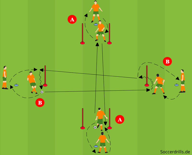 - Die Spieler aus den B-Gruppen passen hin und her und visieren dabei immer eine Seite der jeweiligen Stange an. Der Passempfänger zieht den Ball um die Stange herum, passt dann zurück und stellt sich sofort wieder hinten an.