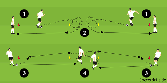 - Hinter den Hütchen führen die Startspieler eine Wende (Turn) aus. Es folgt der Pass zum Partner am Starthütchen.