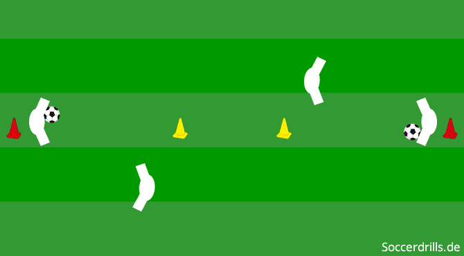 Feldgröße: Abstand von den roten zu den gelben Hütchen jeweils 5 Meter, die Größe des gelben Hütchentores beträgt ca. 2 Meter.