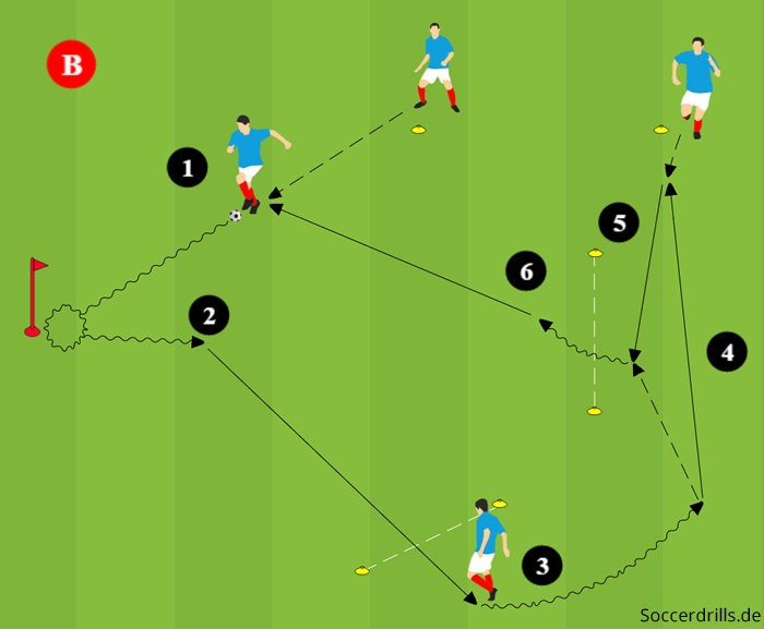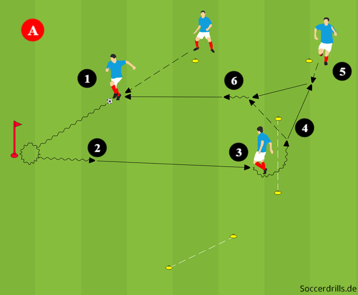 - Es werden zwei Teams gebildet, jedes hat einen Ball. Die Spieler werden an den Markierungen und den Markierungstoren postiert. Mindestens die Position 1 sollte doppelt besetzt sein.