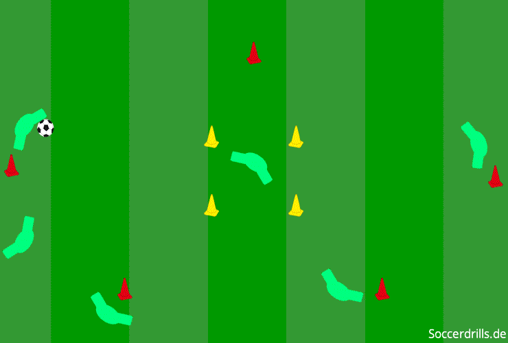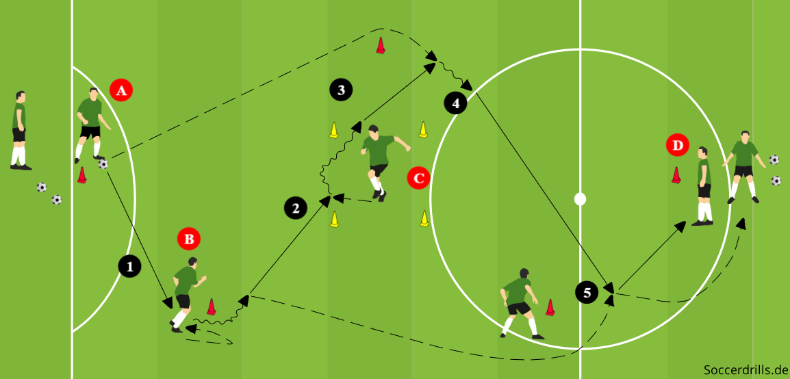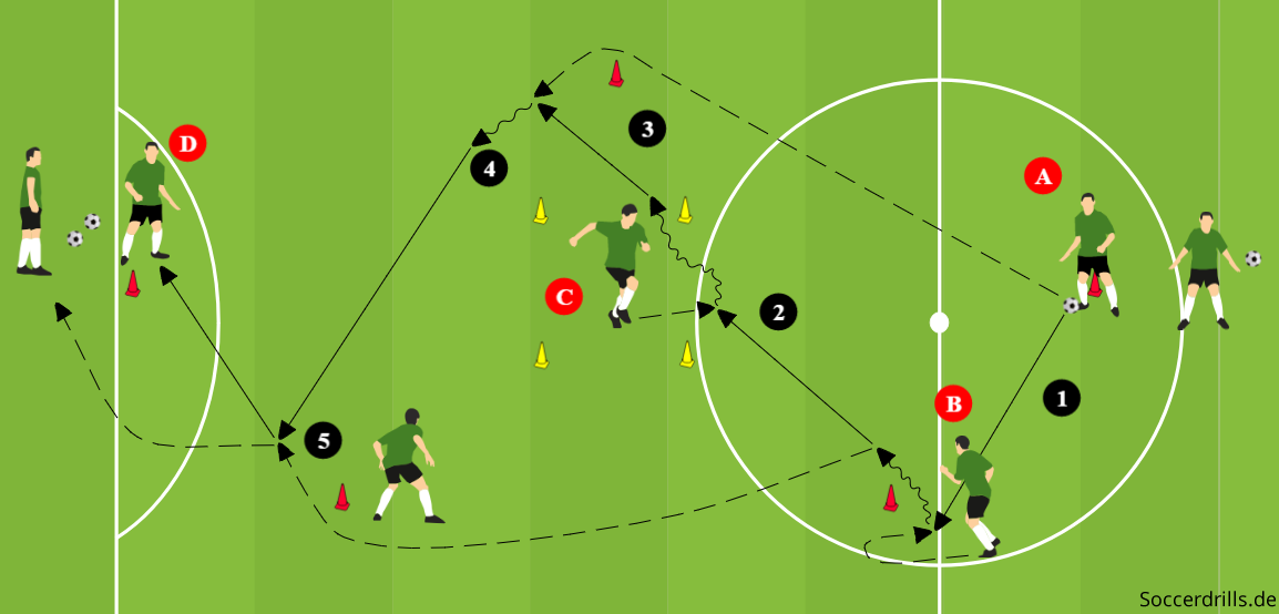 - B passt zu D. Dieser startet den Ablauf von der rechten Seite (siehe untere Grafik), oder umdribbelt das Übungsfeld weiträumig und schließt sich der Startposition A an.