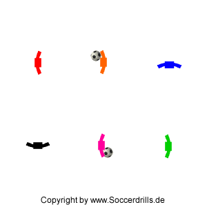 Faustregel: Der Ball wird immer nach rechts gepasst, nicht vergessen! Es sieht aus wie ein Rechteck, schaue Dir die Animation an, aber es handelt sich von der Passfolge um zwei Dreiecke. Die Bälle befinden sich bei Übungsstart auf den zentralen Positionen der horizontalen Linien. Es geht los mit dem Pass nach rechts. Die beiden Passgeber tauschen sofort die Positionen. ACHTUNG! Nach Platztausch gehören diese Spieler zum anderen Passdreieck. Wichtig wird jetzt die Position der Spieler "Blau" und "Schwarz". Sie passen zwar nach rechts, aber diagonal zum zentralen Spieler auf der horizontalen Linie. Die anderen Spieler passen ganz normal nach rechts. Nochmal, die Bälle werden einfach in den beiden Dreiecken gepasst (nach rechts!). Ein Positionswechsel findet nur mit zwei Spielern statt.