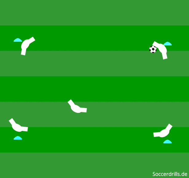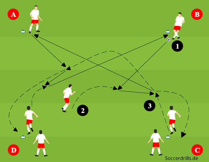 - Spieler D übernimmt die Position von C und C startet ins Feld, der Ablauf beginnt von vorne, diesmal auf der anderen Feldseite. Spieler A und B bleiben auf ihrer Position und werden nach einigen Aktionen ausgetauscht.