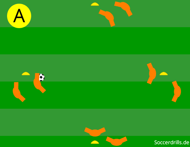 - Jede Ecke in der Raute wird doppelt mit Spielern besetzt. In der Einstiegsübung (A) ist das nicht unbedingt erforderlich.
