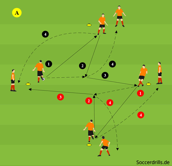- 2. Der Passempfänger leitet den Ball weiter auf den Startspieler im Zentrum.