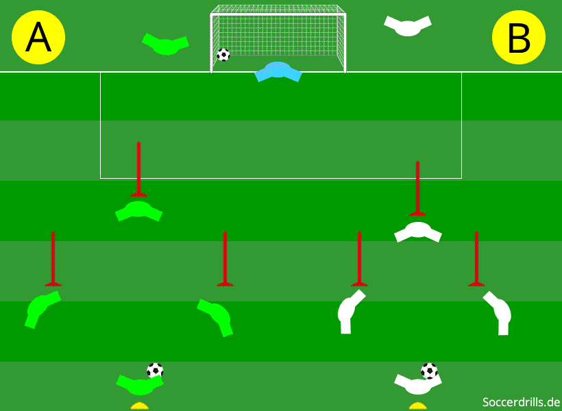 - Die Startpositionen sind mehrfach besetzt, die Positionen an den Stangen einfach. Die Spieler an den Startpositionen haben Bälle, ein Torwart steht im Tor.