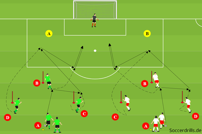 - Nach der Aktion wechselt A wechselt auf Position C, B holt den Ball und wechselt zu A, D zu B und C zu D.
