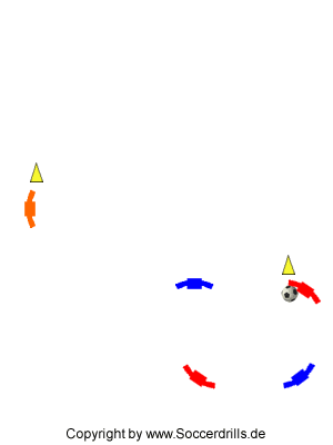 - "Orange" stoppt den Ball und passt auf den wartentenden "Rot" zurück.