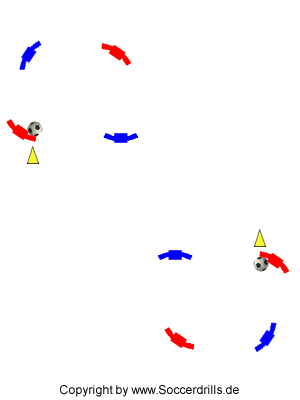 - Auf den Startpositionen, an den Hütchen in der Animation, haben die roten Spieler einen Ball. Sie passen diagonal auf die anderen roten Spieler und verlassen anschließend die Übung in Richtung ihres Passes.