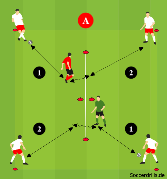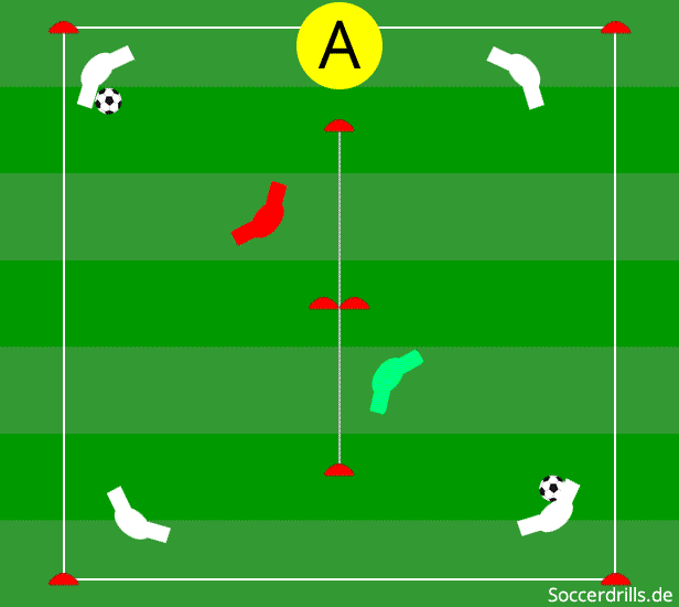 - In jeder Ecke wird ein Spieler postiert. Im Zentrum befinden sich zwei weitere Spieler. Einer gehört zum Übungsfeld oben und einer unten in der Grafik.
