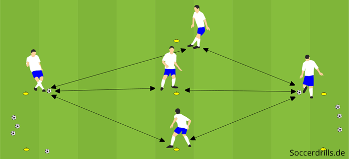 - Das Passspiel erfolgt immer über einen Spieler in der Mitte, der den Ball auf die andere Seite weiterleitet.