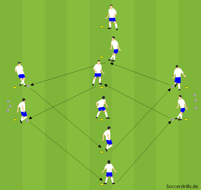 Dargestellt wurde der Ablauf mit 10 Spielern, er ist mit verschiedenen Gruppengrößen möglich. In einer Grafik befinden sich lediglich drei Spieler im Zentrum und an den Seiten jeweils ein Spieler, so lässt sich die Übung auf unterschiedliche Trainingsbeteiligung oder auf weiteren Übungsfeldern gut durchführen.