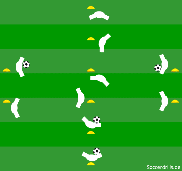 Die Spieler im Zentrum orientieren sich ständig zu beiden Übungsseiten, so sind sie jederzeit anspielbar. Der Pass erfolgt in den richtigen Fuß, der Passempfänger kann aufdrehen und den Ball dann auf die andere Seite weiterleiten.