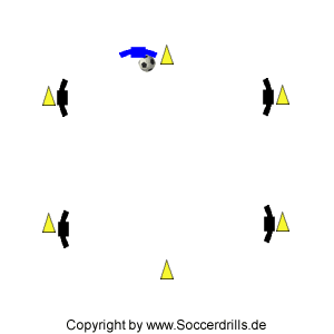Am oberen Hütchen befindet sich ein Spieler mit Ball, der die Übung startet, indem er einen Pass auf den ersten Ballverteiler schlägt. Die Übung beginnt rechts neben dem Hütchen, mit einem Pass nach rechts. Der Passgeber "Blau" läuft anschließend auf die gegenüberliegende Seite des Feldes. Der Ballverteiler, der den ersten Pass erhält, spielt sofort diagonal auf die andere Feldseite. Der Passempfänger kontrolliert den Ball und spielt einen Kurzpass auf den, in Position gelaufenen Spieler "Blau". Dieser zieht den Ball mit der Sohle am Hütchen vorbei. Jetzt beginnt die Übung von vorne, nur von der anderen Übungsseite mit einem Pass nach links.