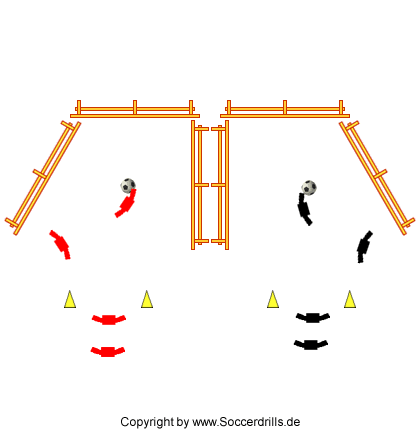 Einen ähnlichen Ablauf gibt es in einer anderen Übung hier auf Soccerdrills, allerdings haben wir dort nicht das Problem mit dem Winkel. Wir schaffen mit den Pässen gegen die Bank immer wieder eine neue Situation, die die Ballkontrolle erschweren und höchste Konzentration vom Übenden verlangen.
