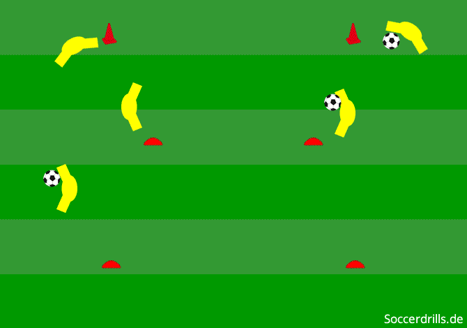 - 4 Bodenmarkierungen, 2 Hütchen und ausreichend Bälle werden benötigt.