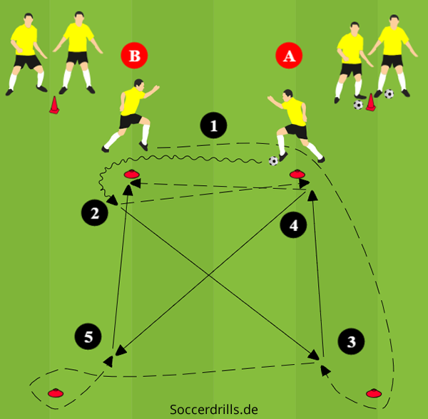 - A dribbelt und B läuft, sie tauschen die Positionen. B sprintet um die Markierung und weiter zur unteren Markierung und umrundet diese.