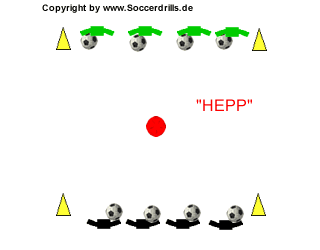 Wettkampf! Diese Übung eignet sich fürs Kindertraining. Kinder lieben Wettkämpfe, deshalb sollte jeder Trainer immer überlegen, ob ein Wettkampf möglich ist, bei jeder Übung. Zwei Teams versuchen einen zentralen Ball, der besonders gekennzeichnet ist oder anders aussehen sollte, über die gegenerische Endlinie zu "treiben". Das Spiel beginnt auf Zuruf des Trainers. Das Spielfeld darf nicht betreten werden, auch nicht um einen Ball zu holen. Welches Team schafft es als erstes, den Ball fünfmal über die gegenerische Linie zu treiben? Spannschüsse sind nicht erlaubt, dies ist eine Passübung.