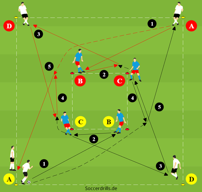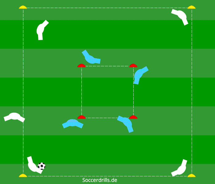 - Nach den Aktionen schließen sich die Spieler außen der nächsten Ecke an. Die Spieler im Quadrat halten ihre Positionen. Nach einiger Zeit wechseln die inneren Spieler nach außen und umgekehrt.