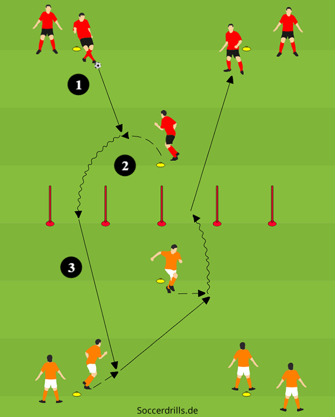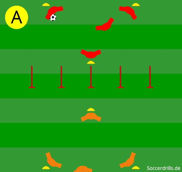 - Vom Stangentor passt er auf einen tief stehenden Spieler zur anderen Übungsseite.