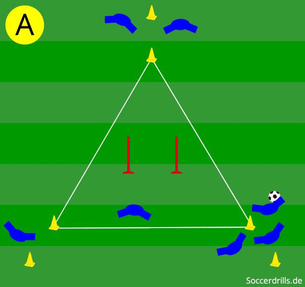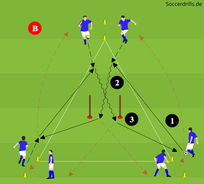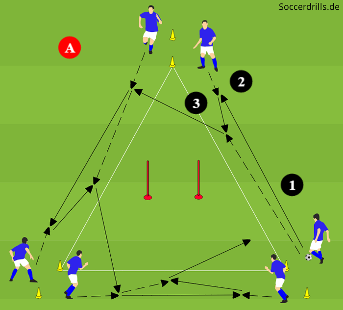 - Ablauf im Uhrzeigersinn. Die Übung startet dann unten links mit einem Pass in die Spitze des Dreiecks.